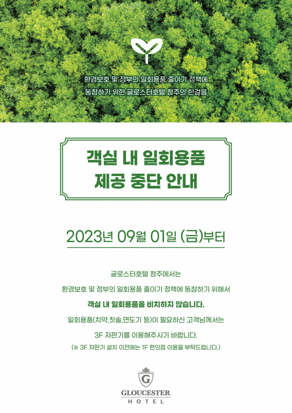 글로스터호텔 청주에서는 환경보호 및 정부의 일회용품 줄이기 정책에 동참하기 위해서 객실 내 일회용품을 비치하지 않습니다.
